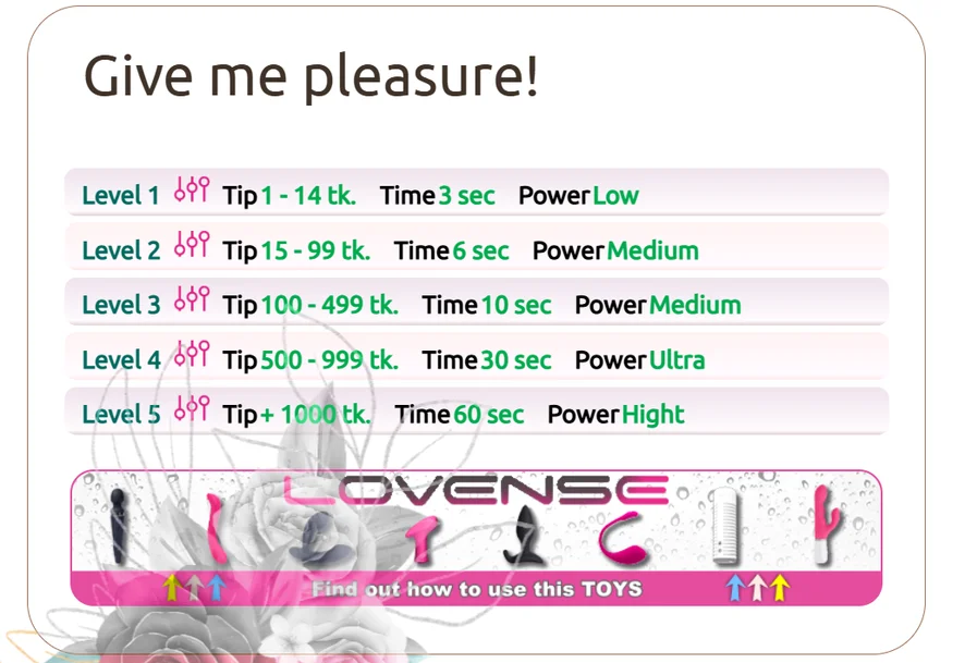 狗爬式, 阿嘿顏, 打屁股, 情色舞蹈, 駱駝趾, 射精, 指交, 脫衣舞, 戀足癖, 按摩, 高跟鞋, 無上裝, 扭扭樂, 女牛仔, 肛交, 吃精液, 皮帶, 屁股對嘴, 假陽具或按摩棒, 髒話, 射精, 騎臉, 臉部, 閃爍, 深喉, 羞辱, 撸管指導, 情境扮演, 性愛玩具, 淋浴, 拳交, 張嘴, 後庭玩具, 吸煙, 乳頭玩具, 口交, 自慰, 乳交, 性高潮, 打飛機, 鞭打拍击, 吞嚥, 裙底, 瑜珈